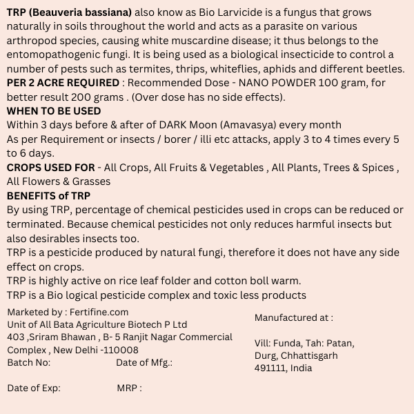TRP (Beauveria bassiana) also known as Bio Larvicide is a fungus that grows naturally in soils throughout the world and acts as a parasite on various arthropod species, causing white muscardine disease; it thus belongs to the entomopathogenic fungi. It is being used as a biological insecticide to control a number of pests such as caterpillars like Helicoverpa, Spodoptera, Brinjal Fruit Borer, Diamond Black Moth, Cotton Bollworms, Cutworms, Leaf Webber, Semi looper, Looper and different beetles.