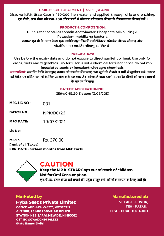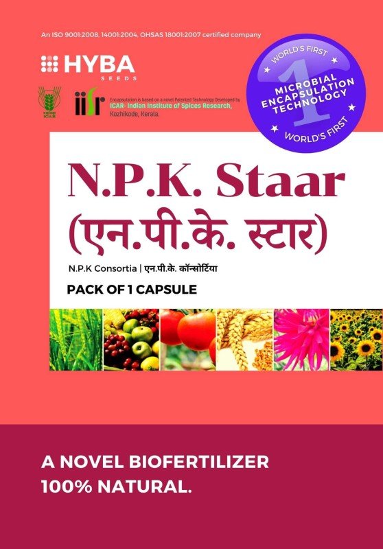 NPK STAAR CAPSULE ( BIO NPK ) - contain Azotobacter , Phosphate solubilizing & Potassium mobilizing bacteria.The capsules contains nitrogen fixing bacteria, P solubilizing bacteria and K solubilizing bacteria that enhance nutrient availability and promote plant growth.