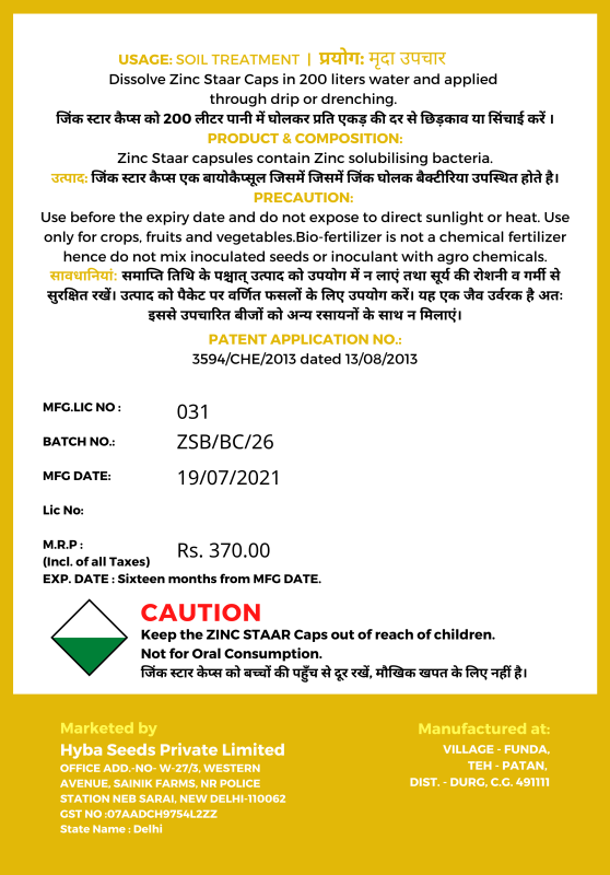ZINC STAAR CAPSULE (BIO ZINC)- Zinc Staar capsules contain Zinc solubilizing bacteria.
